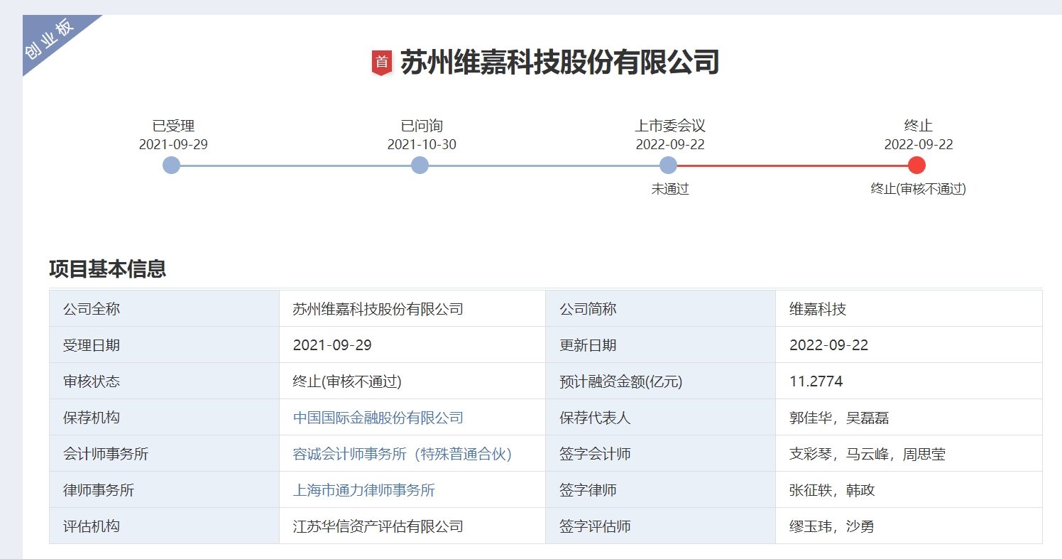 澎湃新闻从知情人士处获悉,该项目为苏州维嘉科技股份有限公司(简称“维嘉科技”)。2021年9月,维嘉科技向创业板递交了招股书,2022年9月上会被否。