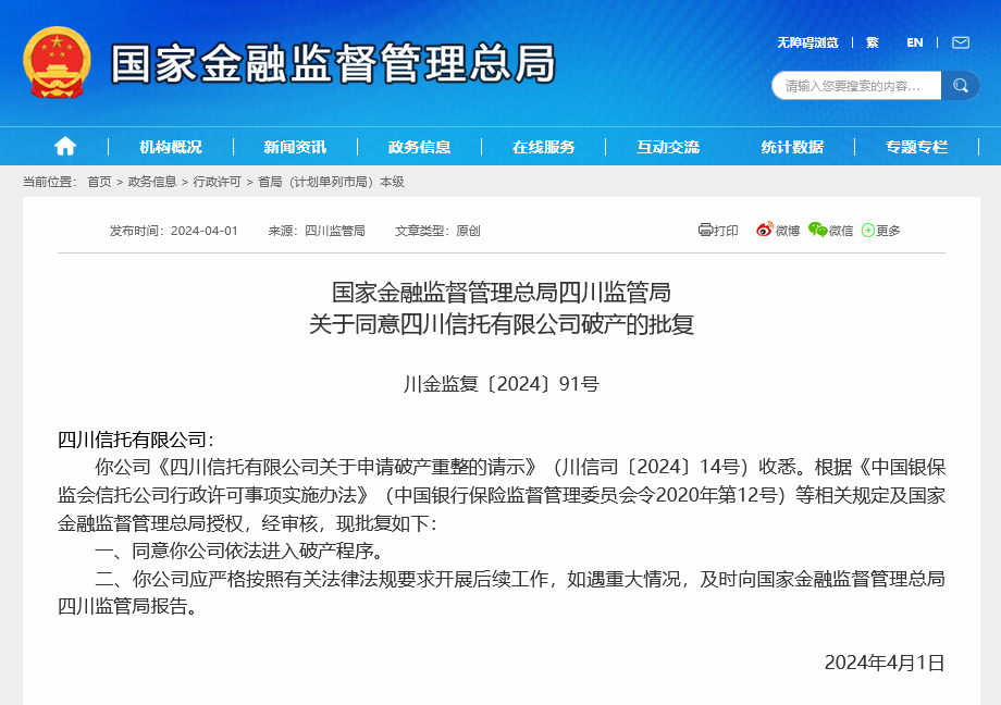今日,国家金融监督管理总局四川监管局挂出行政批复,同意四川信托依法进入破产程序。这也意味着,四川信托将成为新华信托后第二家进入破产程序的信托公司,同时也将是《信托法》颁布以来国内首家步入破产重整程序的信托公司。