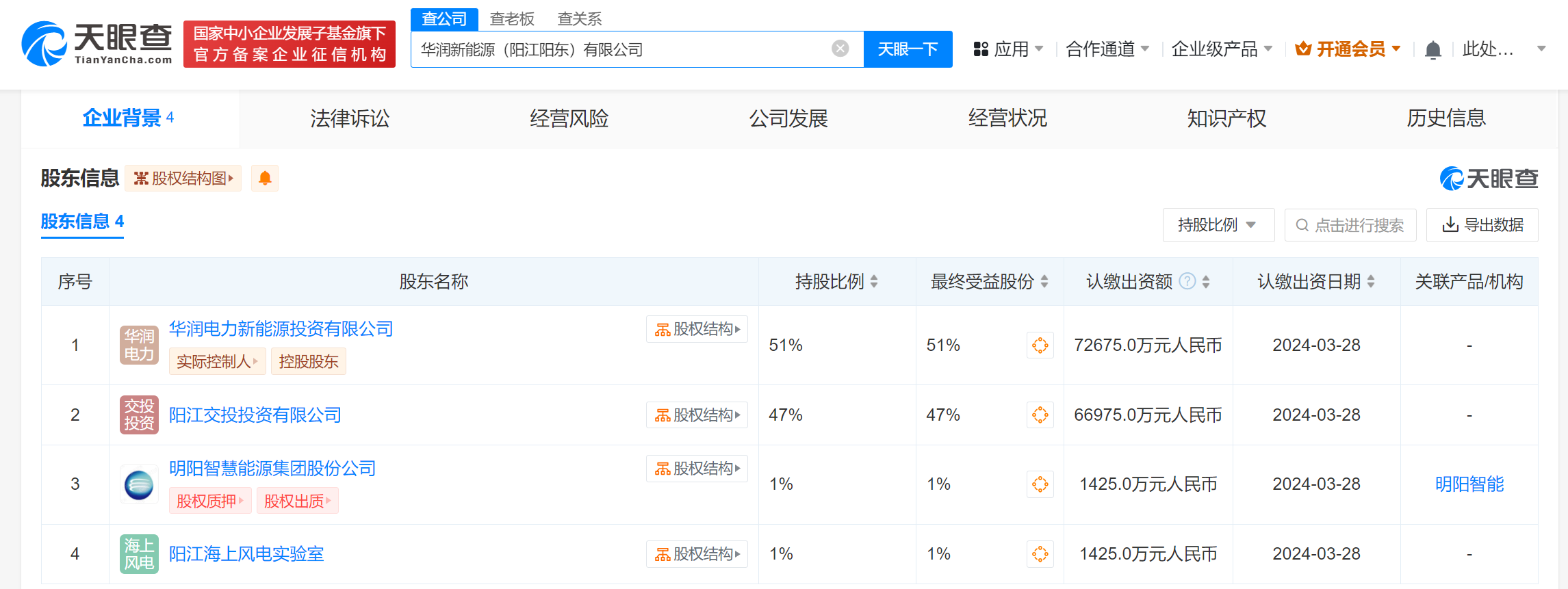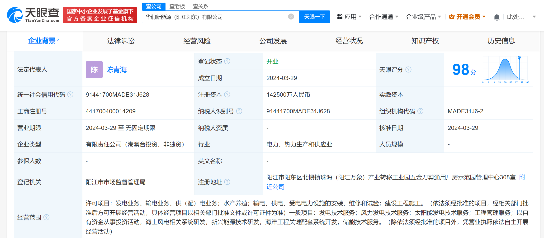 天眼查App显示,近日,华润新能源(阳江阳东)有限公司成立,法定代表人为陈青海,注册资本14.25亿人民币,经营范围含发电技术服务、风力发电技术服务、太阳能发电技术服务、工程管理服务、以自有资金从事投资活动、海上风电相关系统研发、新兴能源技术研发、海洋工程关键配套系统开发、储能技术服务等。股东信息显示,该公司由华润电力新能源投资有限公司、阳江交投投资有限公司、明阳智能、阳江海上风电实验室共同持股。