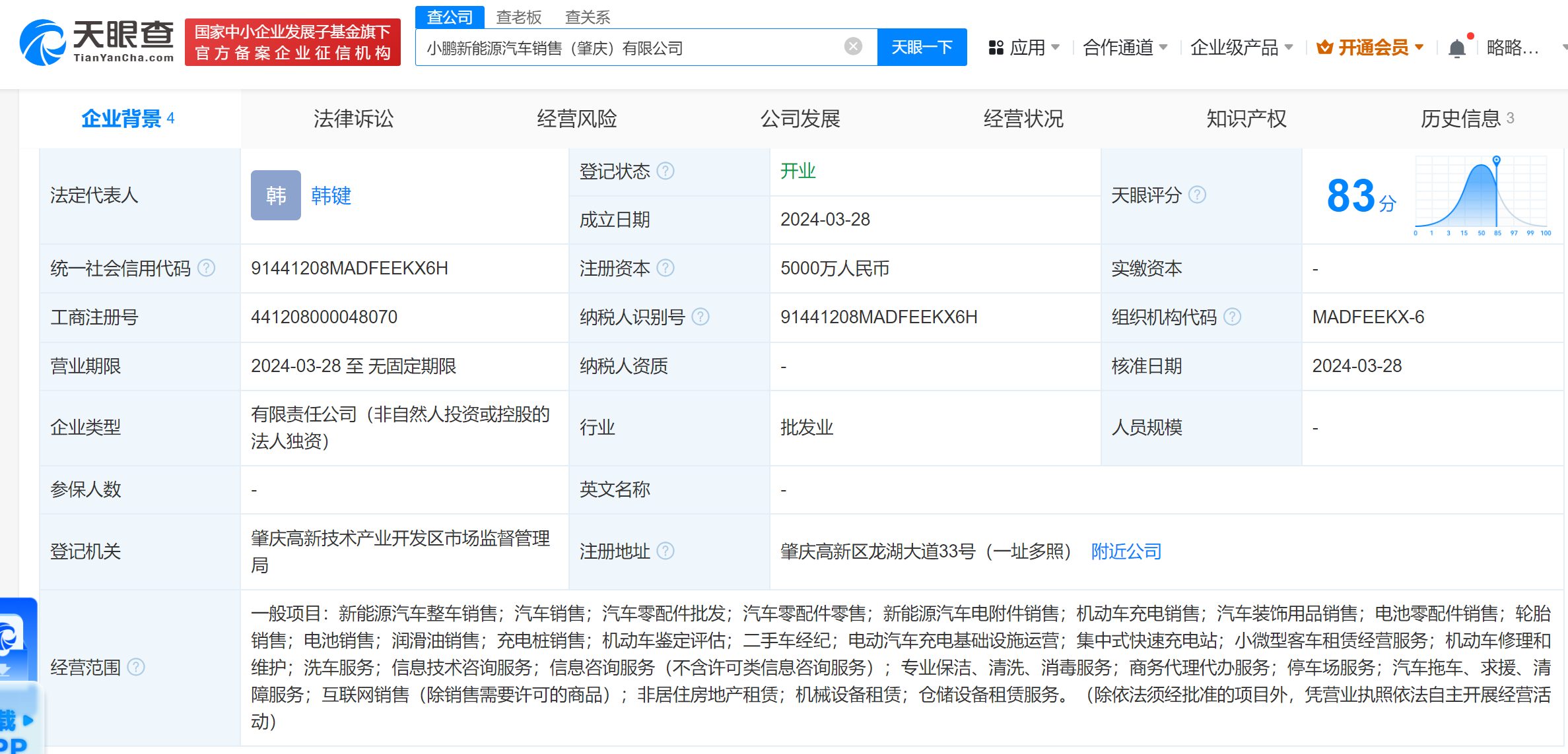 天眼查App显示,近日,小鹏新能源汽车销售(肇庆)有限公司成立,法定代表人为韩键,注册资本5000万人民币,经营范围含新能源汽车整车销售、新能源汽车电附件销售、电池销售、充电桩销售、电动汽车充电基础设施运营等。股东信息显示,该公司由肇庆小鹏汽车有限公司全资持股。