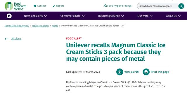 英国食品标准局官网3月29日发布消息称,因为可能含有金属碎片,联合利华(Unilever)正在召回多个生产批次的梦龙经典系列冰淇淋。3月30日,香港食物环境卫生署和澳门特区政府均呼吁市民停止食用相关产品,香港食物环境卫生署称,根据初步调查,香港本地没有相关特定产品批次出售。