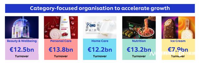 对比来看,美容健康板块(AHC、多芬、夏士莲、Clear等)营收125亿欧元,基础销售额增长8.3%;个人护理板块(中华牙膏、舒耐、力士等品牌)营收138亿欧元,基础销售额增长8.9%;家庭护理板块(Comfort金纺、沁园等)营收122亿欧元,基础销售额增长5.9%;营养板块(家乐、植卓肉匠等)营收132亿欧元,基础销售额同比增长7.7%。