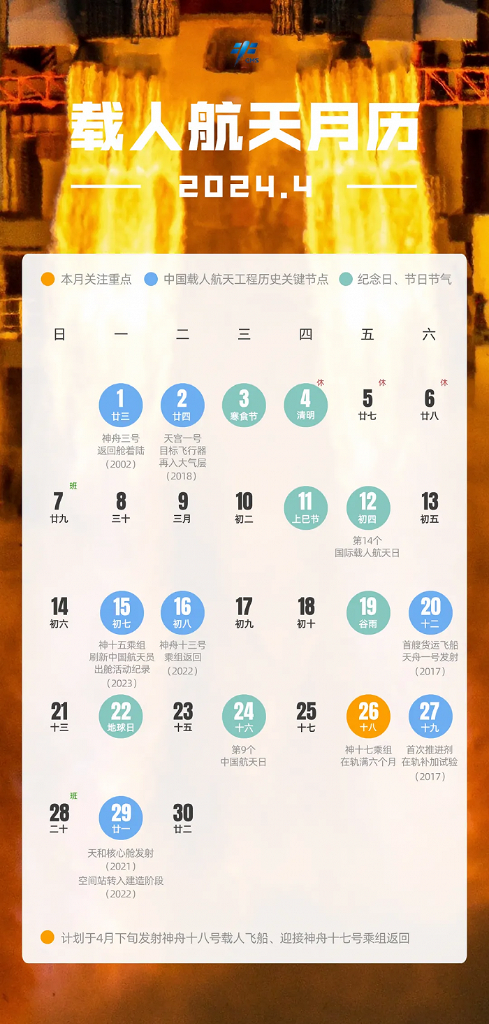 3月31日,据“中国载人航天”微信公众号消息,载人航天工程版月历公布,计划于4月下旬发射神舟十八号载人飞船、迎接神舟十七号乘组返回。