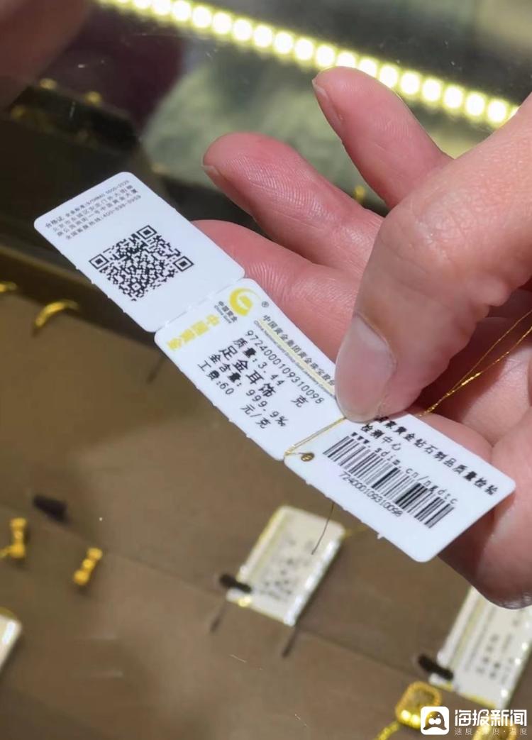 那么,如何分辨“中国黄金”店铺的金饰是从官方渠道进货的呢?有店员向记者展示了金饰的价签,“三联价签,有二维码可以扫出检测结果,这样的就是中国黄金自己生产的金饰。”但记者发现,价签仅有一根线固定在金饰上,是否会被更换也未可知。