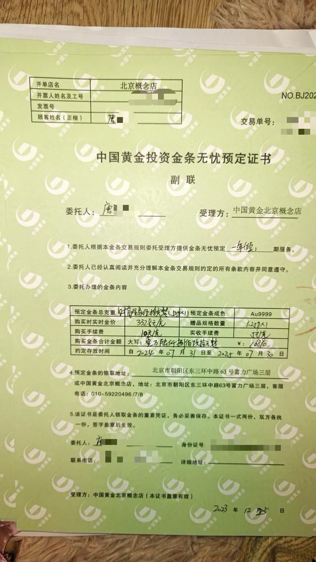 从唐先生提供的一份“中国黄金投资金条无忧预定证书”上,记者看到,该交易受理方为中国黄金北京概念店,双方约定该服务为一年期,唐先生称,根据协议,购买者可获得一个1.25g的黄金赠品,此后每次续约时都可以获得一次同样的赠品。唐先生表示,去年年底发现该店关闭后,意识到可能无法兑换所购金条,其立即选择了报警。