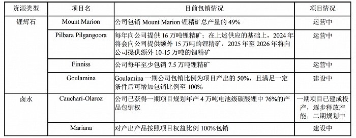 赣锋锂业在全球范围内已签订的锂资源及锂资源项目产出锂产品包销情况