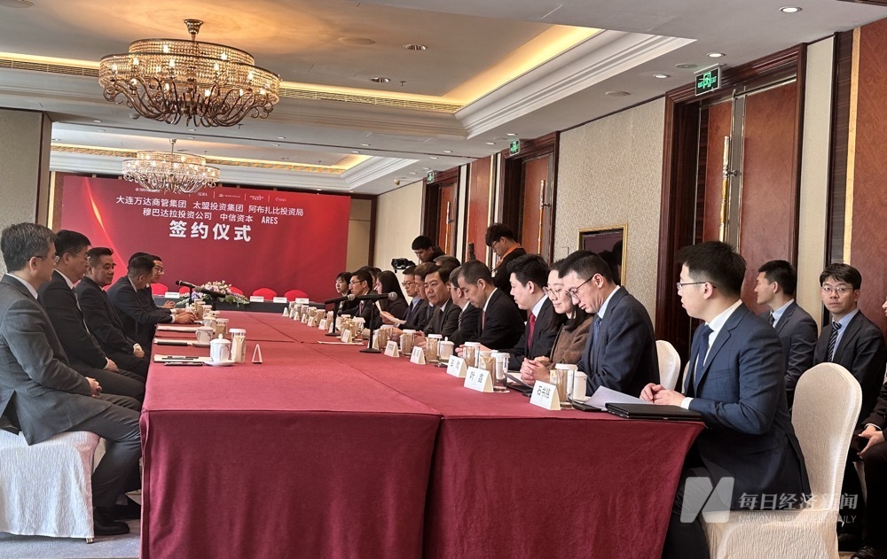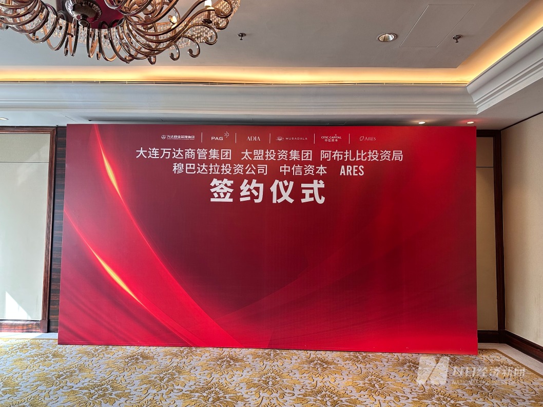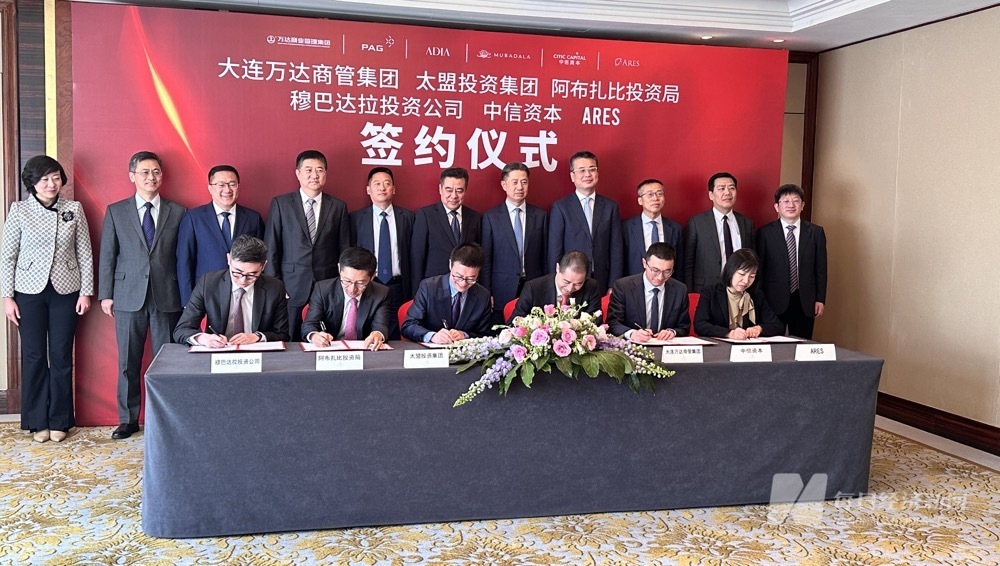 3月30日上午,大连万达商管集团与太盟投资集团、阿布扎比投资局、穆巴达拉投资公司、中信资本、ARES在大连香格里拉酒店举行签约仪式。