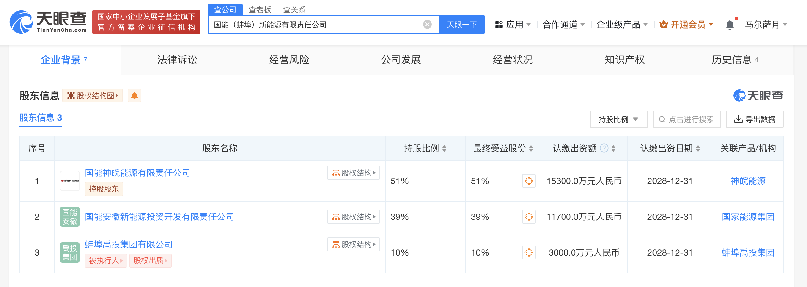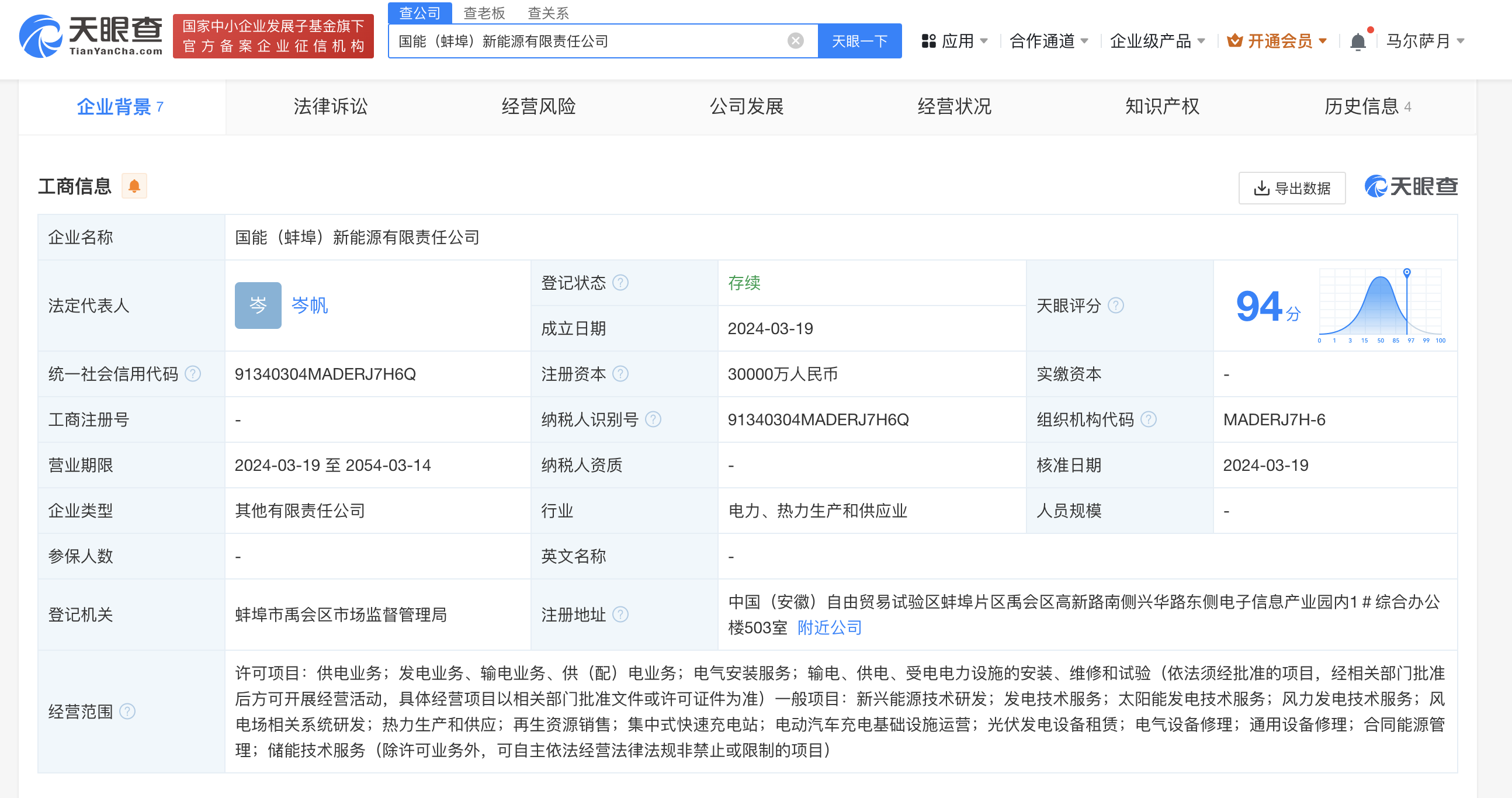 天眼查App显示,近日,国能(蚌埠)新能源有限责任公司成立,法定代表人为岑帆,注册资本3亿人民币,经营范围含供电业务,发电业务、输电业务、供(配)电业务,新兴能源技术研发,太阳能发电技术服务,集中式快速充电站,光伏发电设备租赁等。股东信息显示,该公司由国家能源集团旗下国能神皖能源有限责任公司、国能安徽新能源投资开发有限责任公司及蚌埠禹投集团有限公司共同持股。