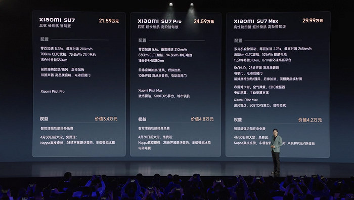 3月28日晚,小米集团董事长雷军在小米汽车上市发布会上表示,小米SU7共提供标准版、Pro、Max三个版本,售价分别为21.59万元、24.59万元、29.99万元。