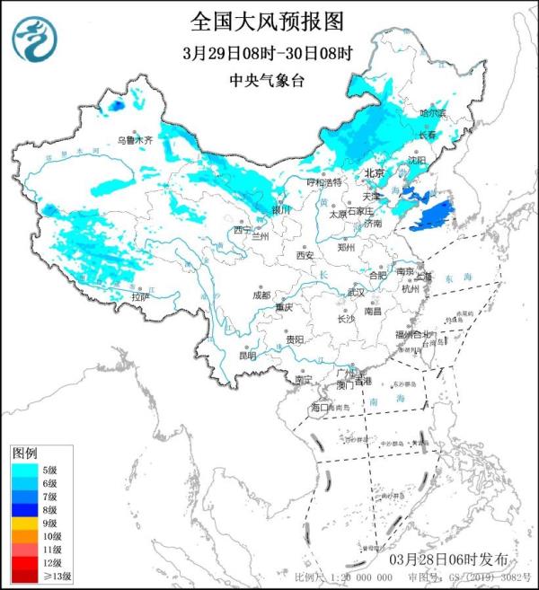 3月29日08时至30日08时,新疆北疆地区、西藏中西部、内蒙古大部、甘肃河西、河北北部、吉林中西部等地的部分地区有5~6级风、阵风7~8级,局地9~10级;黄海北部海域的风力可达7~8级,阵风9~10级。