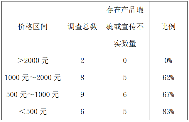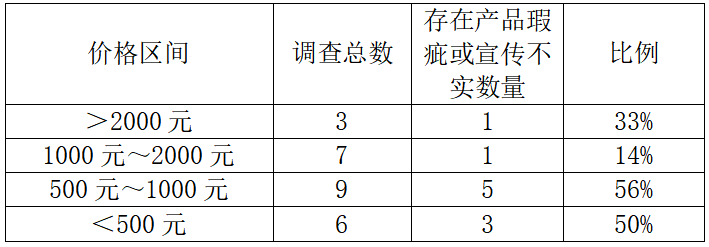 上海市消保委指出,从价格区间对应的存在产品瑕疵或宣传不实情况来看,除了高端产品之外,其他档次产品均存在相关问题,包括知名品牌与非品牌产品。