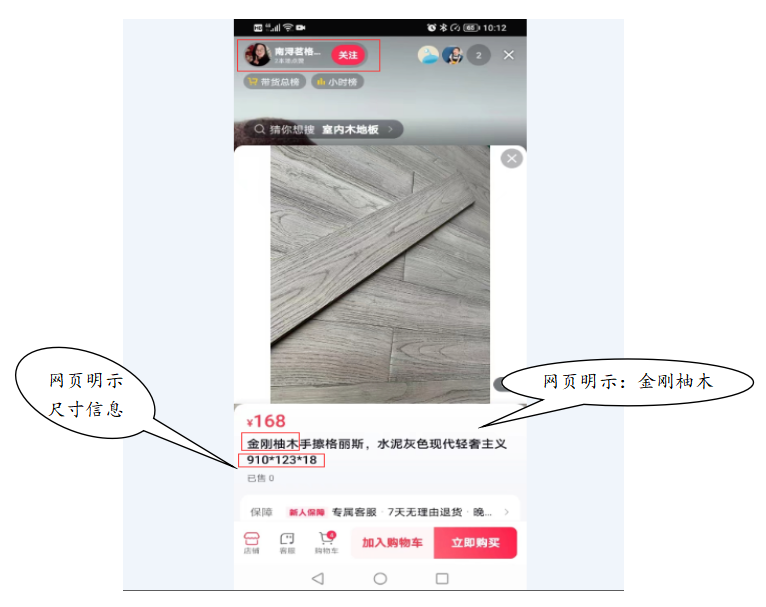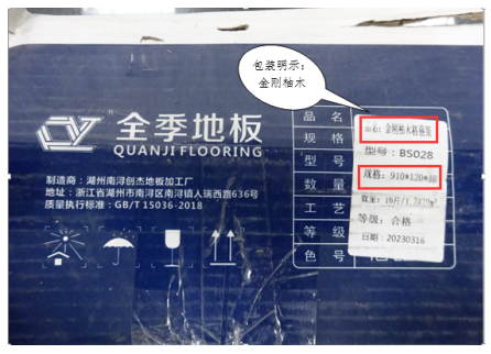 在“南浔茗格地板商行”直播间一款型号规格为“BS028;910mm×120mm×18mm”的实木地板调查中发现,直播间页面信息和到货包装明示木材名称为金刚柚木,实测为刺槐,涉嫌以次充好。此外,页面信息明示尺寸为910mm×123mm×18mm,包装明示尺寸为910mm×120mm×18mm,页面信息与实际到样包装明示尺寸信息不一致,存在欺骗行为;明示厚度尺寸为18mm,实测厚度为16.50mm~16.61mm,标准要求为17.70mm~18.30mm,涉嫌偷工减料,欺骗消费者。
