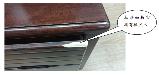 在“典雅木艺品牌家具”直播间一款型号规格为500mm×500mm×500mm的床头柜产品调查中发现,主播口播讲解和产品链接页面详情中明示抽屉面板所用的木材为胡桃木,但抽屉面板实测有橡胶木,标识与实物一致性不符合,存在欺骗行为。