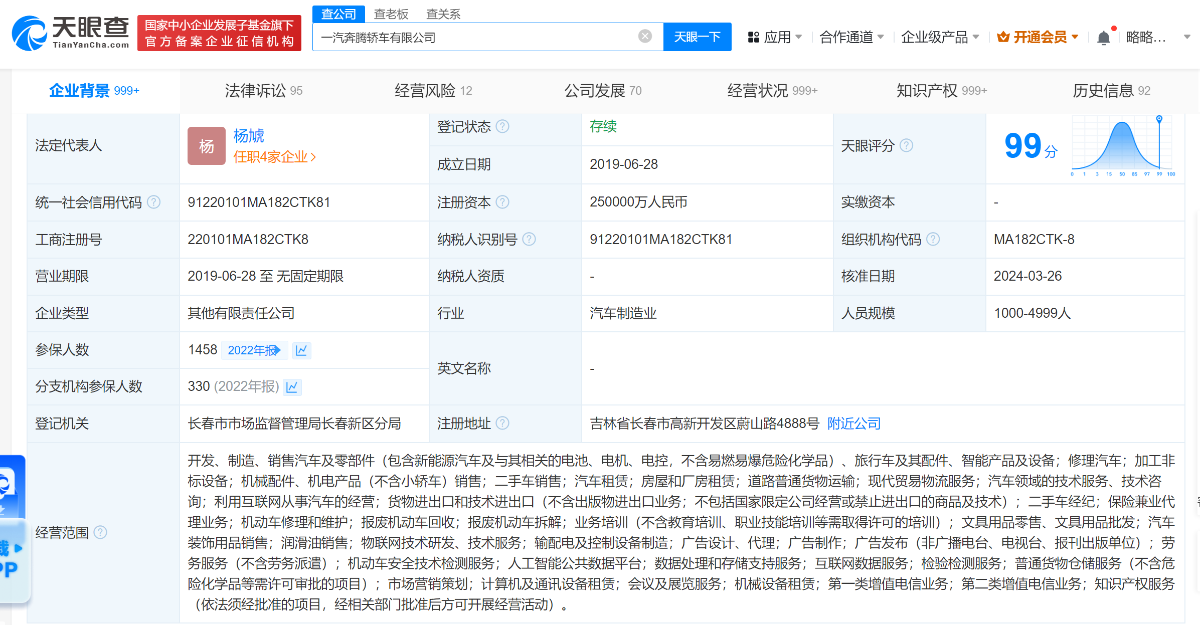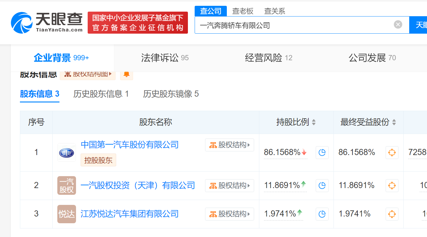 该公司成立于2019年6月,法定代表人为杨虓,经营范围含开发、制造、销售汽车及零部件、旅行车及其配件、智能产品及设备等。股东信息显示,该公司由中国第一汽车股份有限公司、一汽股权投资(天津)有限公司、江苏悦达汽车集团有限公司分别持股约86.16%、11.87%、1.97%。