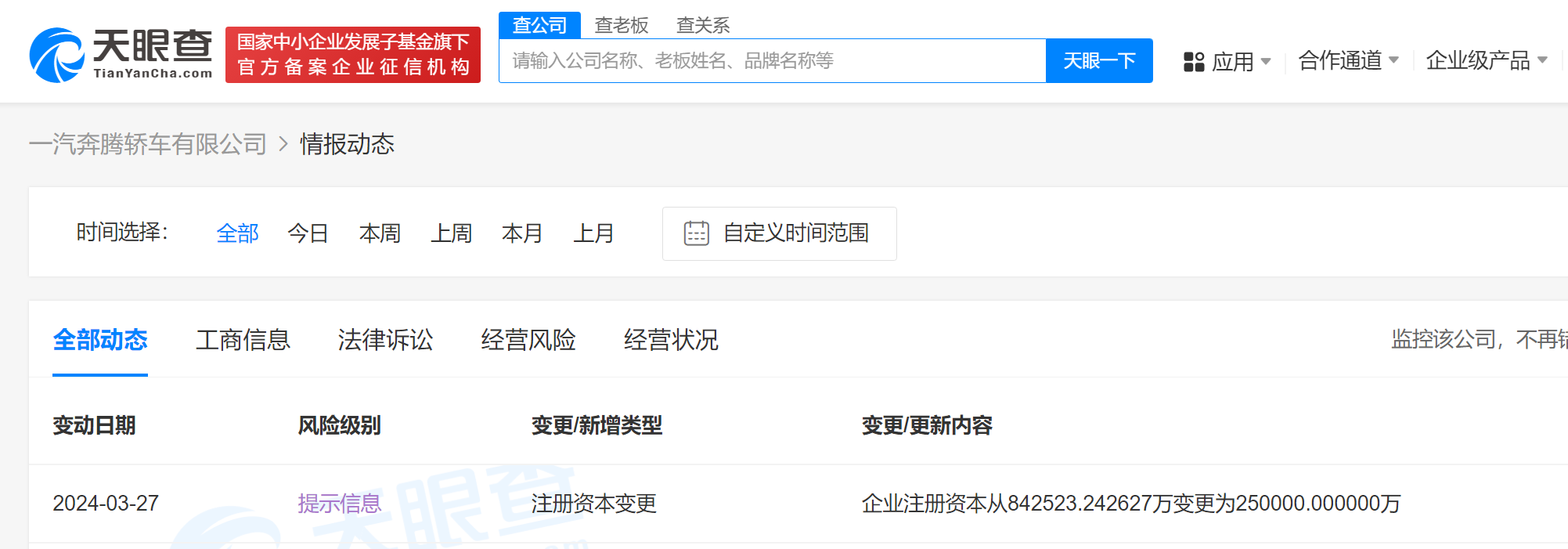 天眼查App显示,3月27日,一汽奔腾轿车有限公司发生工商变更,注册资本由约84.25亿人民币减至25亿人民币。