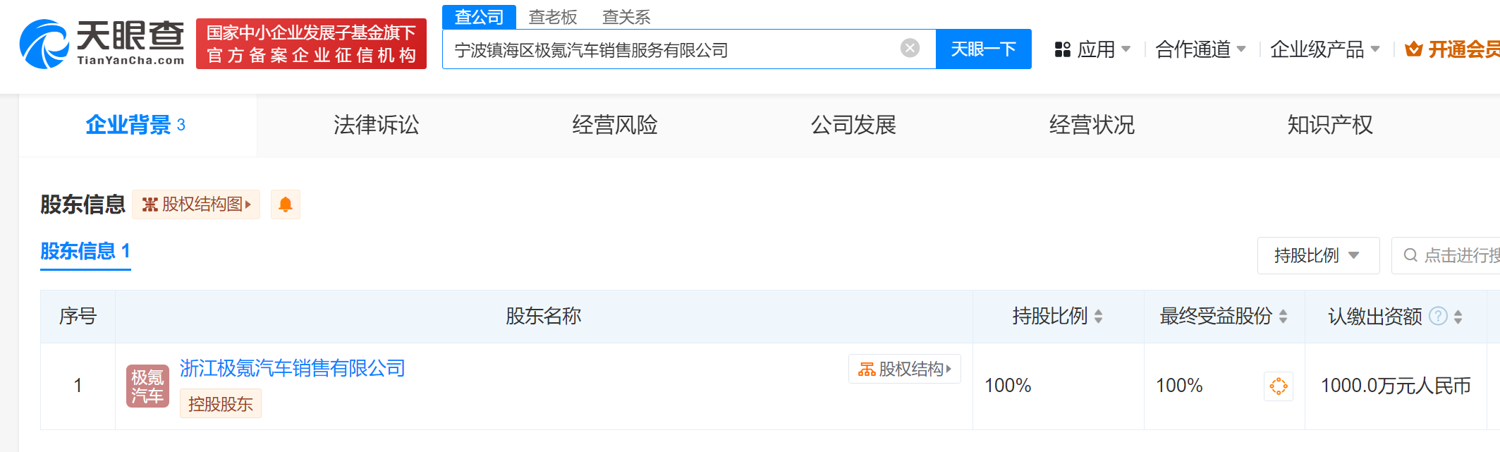 天眼查App显示,3月25日,宁波镇海区极氪汽车销售服务有限公司成立,法定代表人为林金文,注册资本1000万人民币,经营范围含汽车销售、汽车零配件零售、汽车装饰用品销售、充电桩销售、智能车载设备销售、电动汽车充电基础设施运营等。股东信息显示,该公司由浙江极氪汽车销售有限公司全资持股。