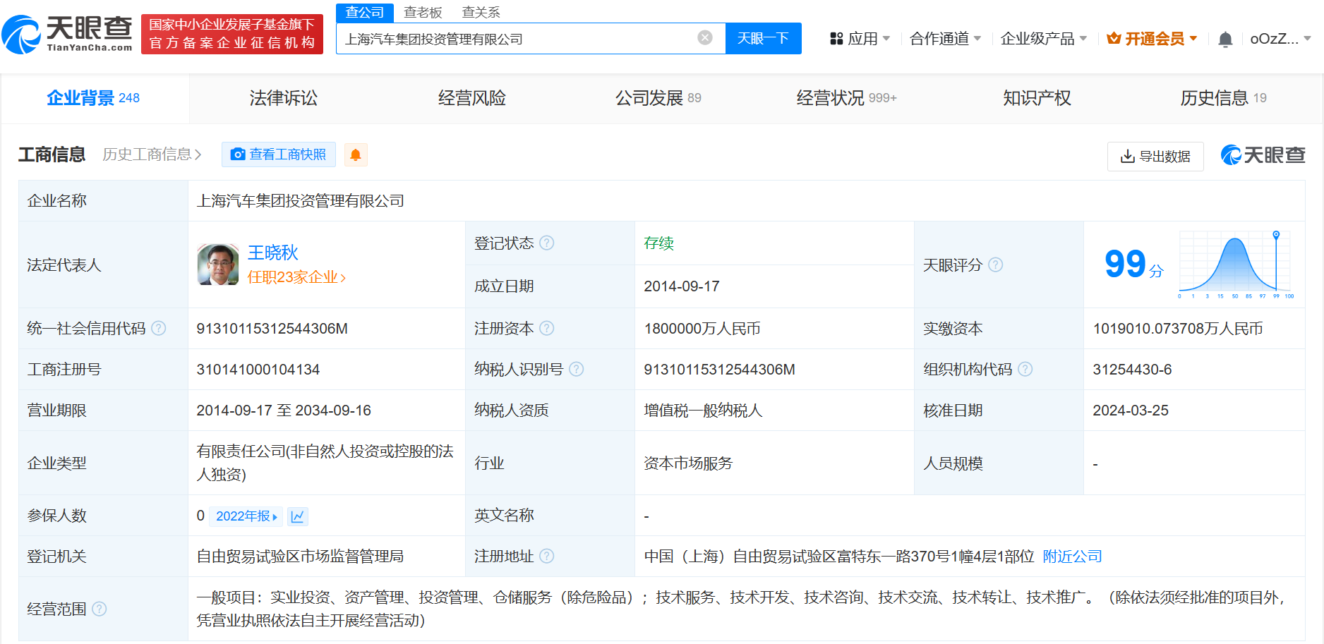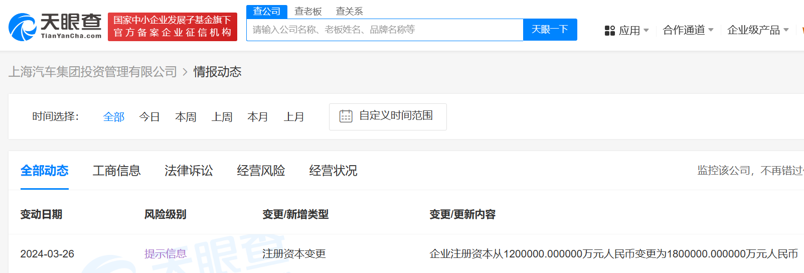天眼查App显示,近日,上海汽车集团投资管理有限公司发生工商变更,注册资本由120亿人民币增至180亿人民币,增幅50%。