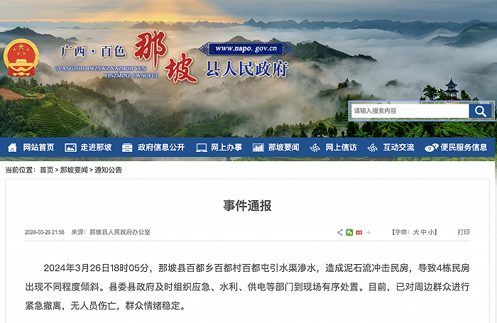 3月26日,广西那坡县通报,3月26日18时05分,那坡县百都乡百都村百都屯引水渠渗水,造成泥石流冲击民房,导致4栋民房出现不同程度倾斜。县委县政府及时组织应急、水利、供电等部门到现场有序处置。目前,已对周边群众进行紧急撤离,无人员伤亡,群众情绪稳定。