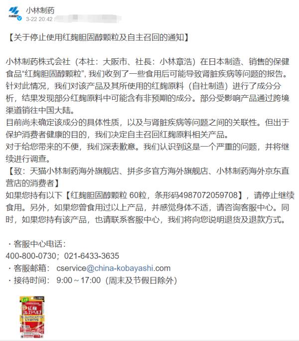 3月22日,小林制药在社交平台官方账号发布《关于停止使用红麹胆固醇颗粒及自主召回的通知》,通知提醒持有红麹胆固醇颗粒(60粒,条形码4987072059708)的消费者停止继续食用。