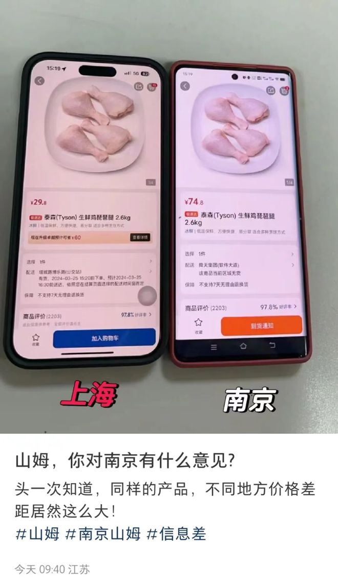有网友发帖称,自己在南京山姆线上下单某款2.6kg的生鲜鸡琵琶腿,售价74.8元,然而在上海山姆线上购买同款商品,售价却只有29.8元。