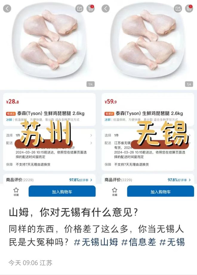 还有其他江苏网友晒出比价结果,同款鸡腿在苏州、无锡的价格都有所不同。