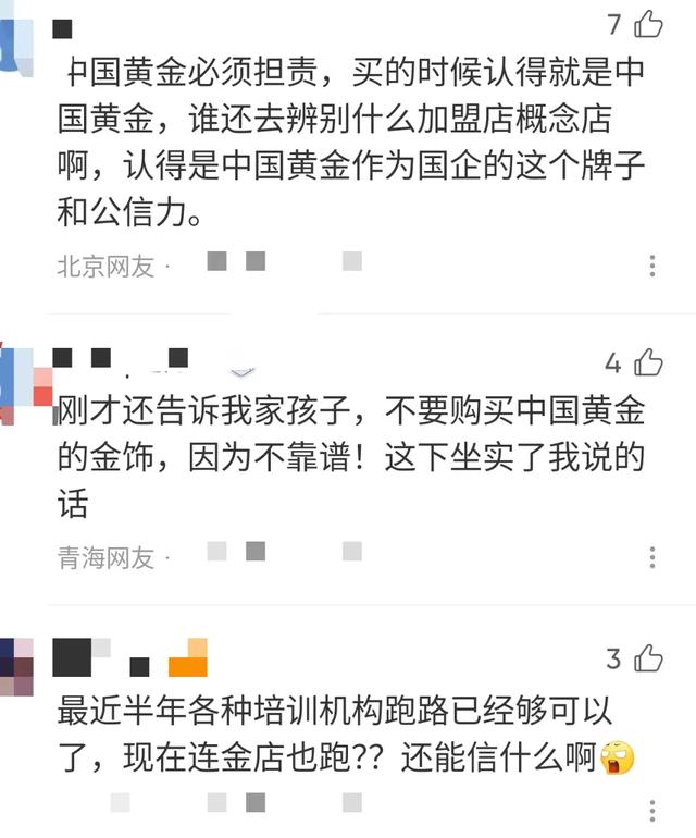 针对此事,网友热议:“金店也跑路?还能信什么啊”“中国黄金必须担责,买的时候认的就是中国黄金,谁还去辨别什么加盟店概念店啊,认的就是中国黄金作为国企的牌子和公信力”。