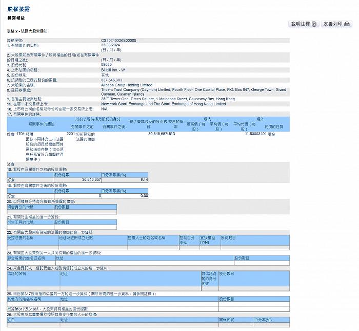 3月26日,港交所文件显示,淘宝中国完成出售约3084.6万股哔哩哔哩ADR。