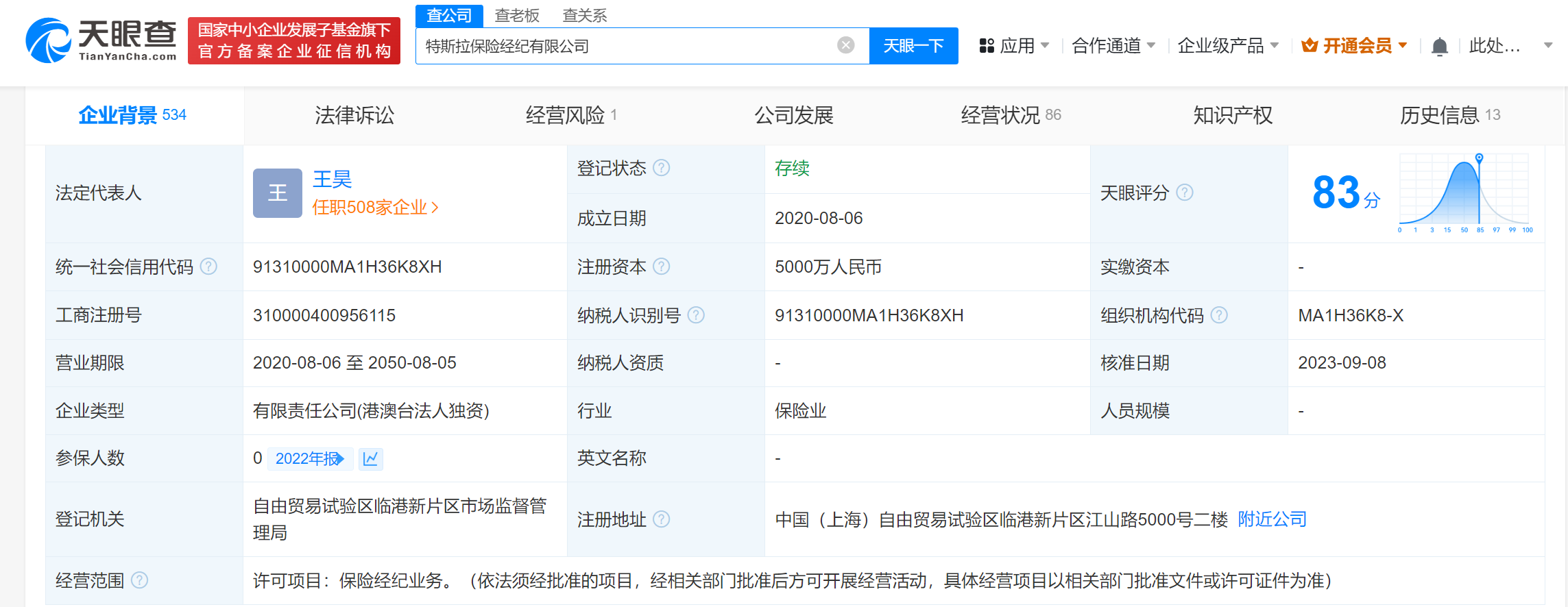 该公司成立于2020年8月,法定代表人为王昊,注册资本5000万人民币,经营范围为保险经纪业务。股东信息显示,该公司由特斯拉汽车香港有限公司全资持股。