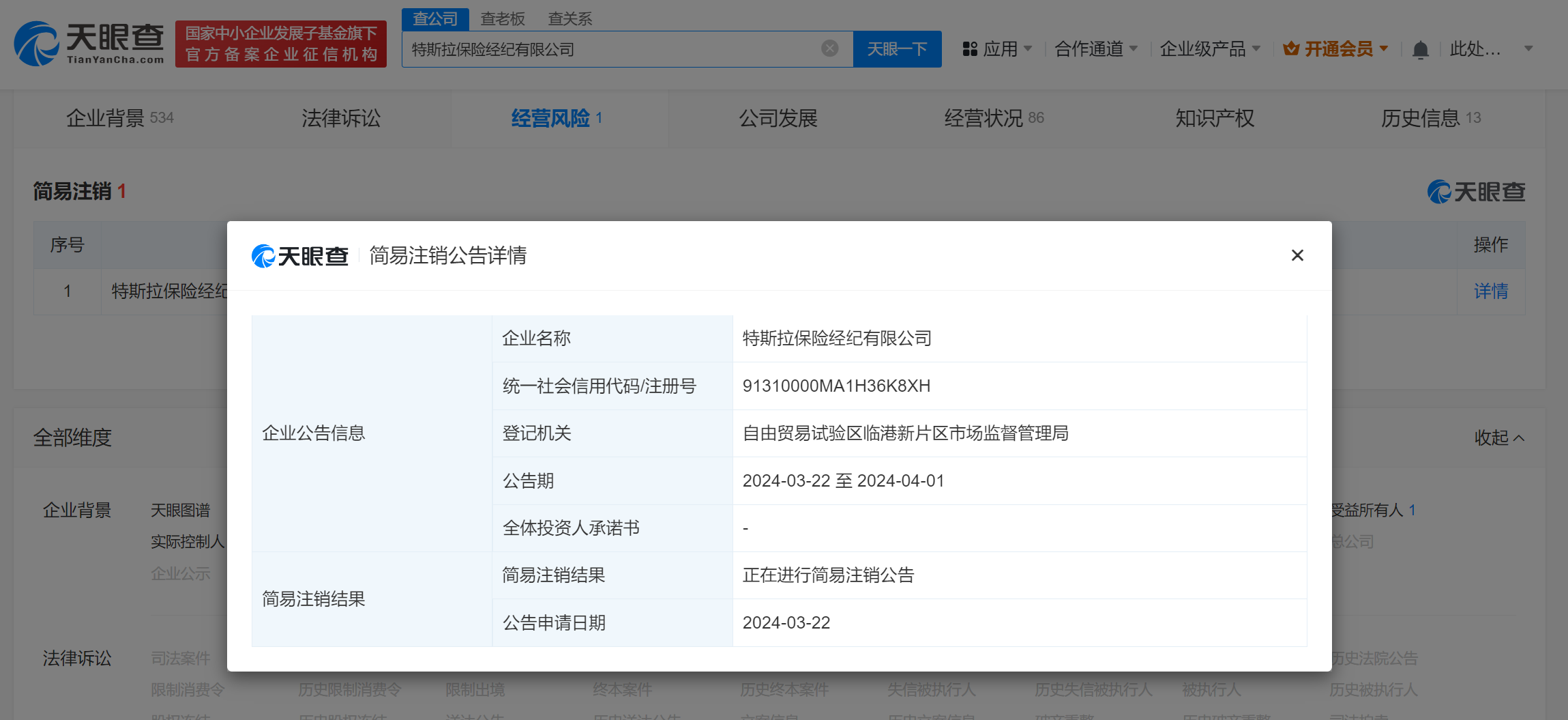 天眼查App显示,近日,特斯拉保险经纪有限公司新增一则简易注销公告,公告期自3月22日至4月1日。