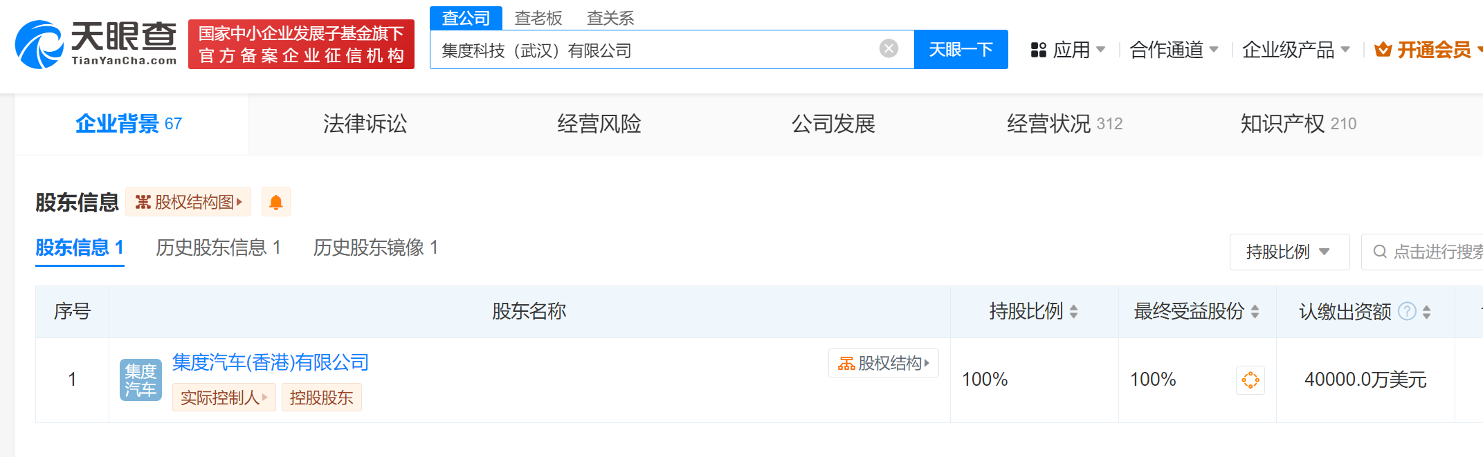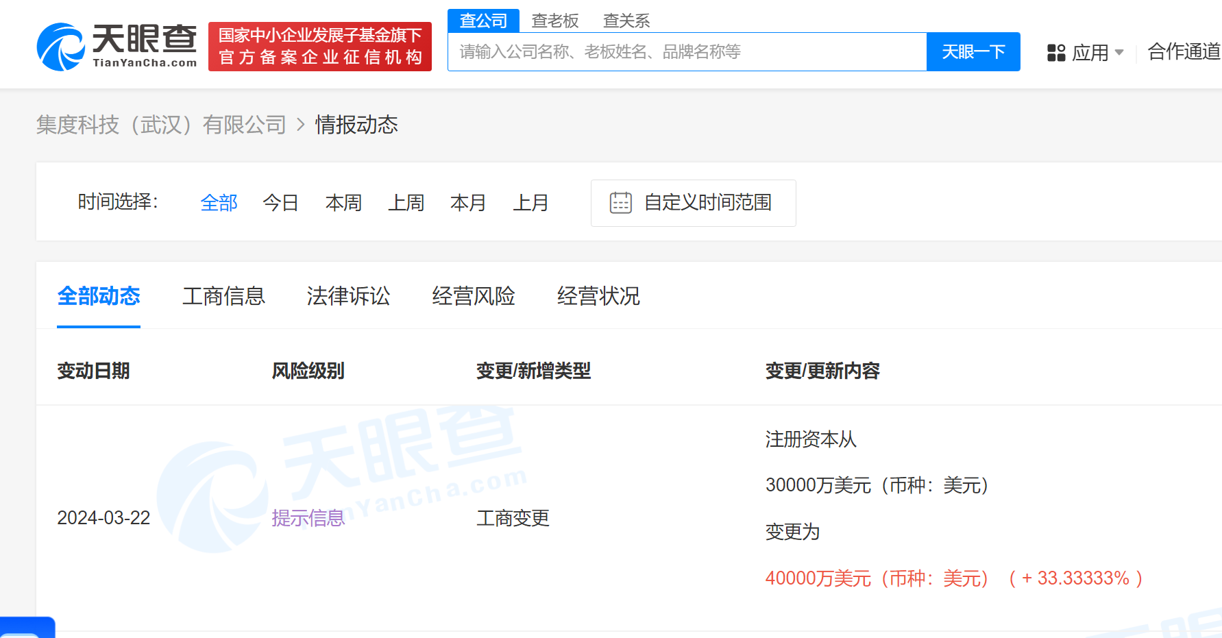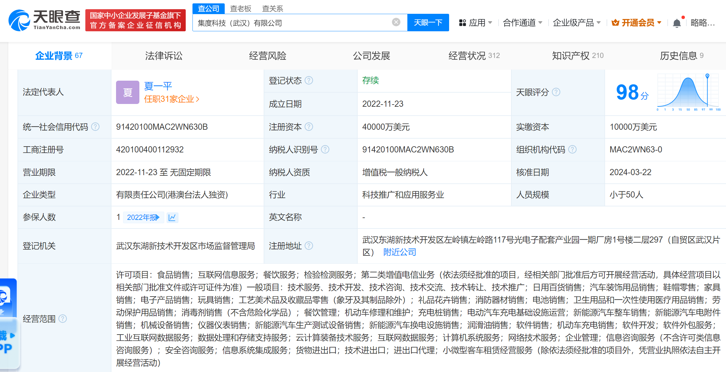 天眼查App显示,近日,集度科技(武汉)有限公司发生工商变更,注册资本由3亿美元增至4亿美元,增幅约33.33%。该公司成立于2022年11月,法定代表人为夏一平,经营范围包括互联网信息服务、电池销售、电动汽车充电基础设施运营、新能源汽车整车销售、新能源汽车换电设施销售等。股东信息显示,该公司由集度汽车(香港)有限公司全资持股。