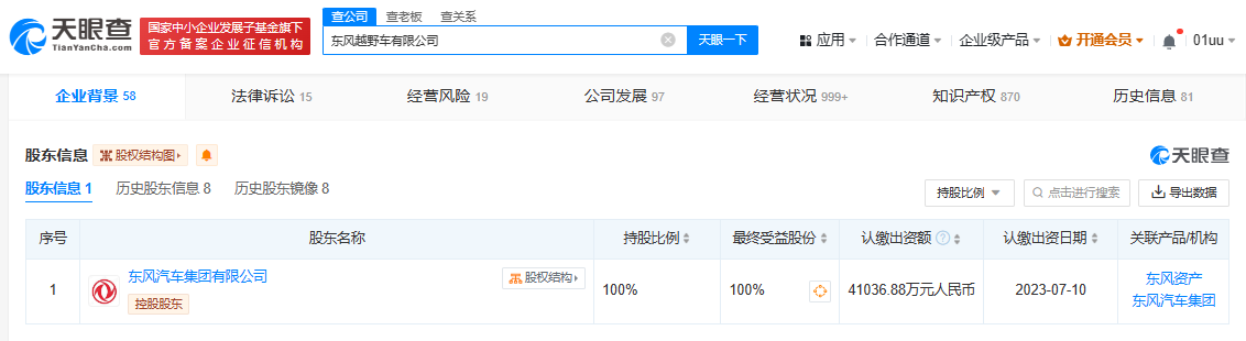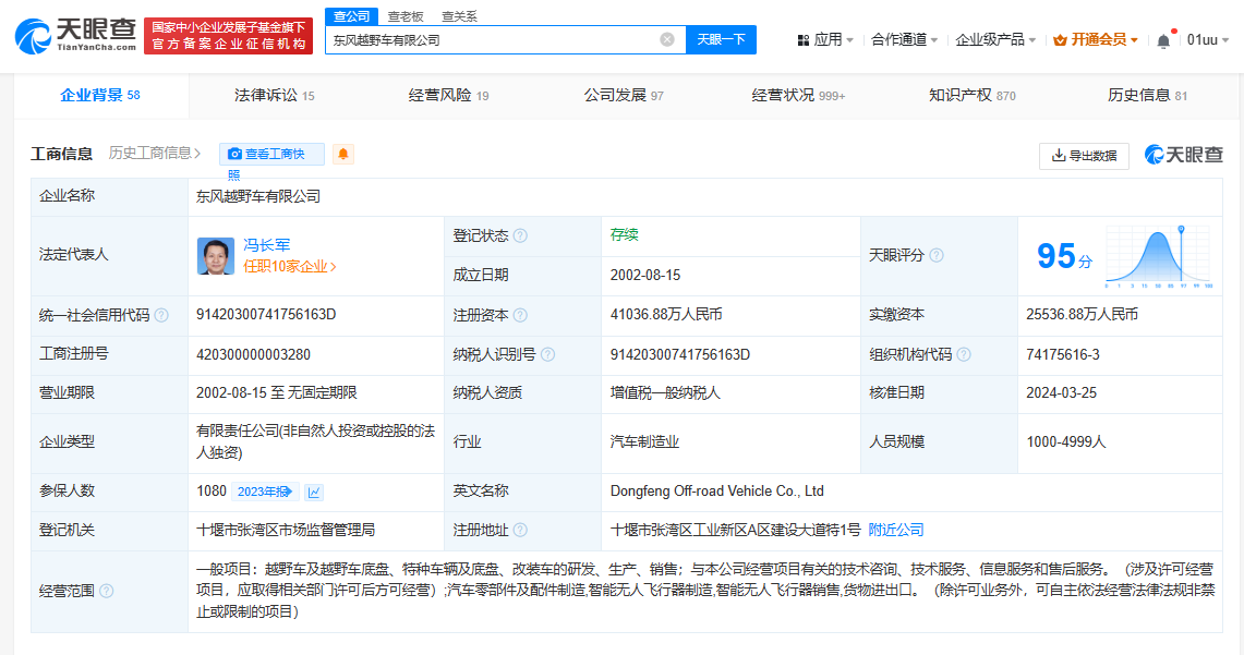 东风越野车有限公司成立于2002年8月,法定代表人为冯长军,注册资本约4.1亿人民币,由东风汽车集团有限公司全资持股。