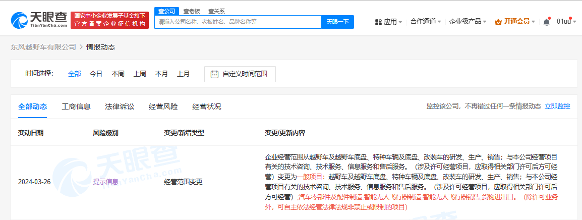天眼查App显示,近日,东风越野车有限公司发生工商变更,经营范围新增汽车零部件及配件制造、智能无人飞行器制造、智能无人飞行器销售、货物进出口。