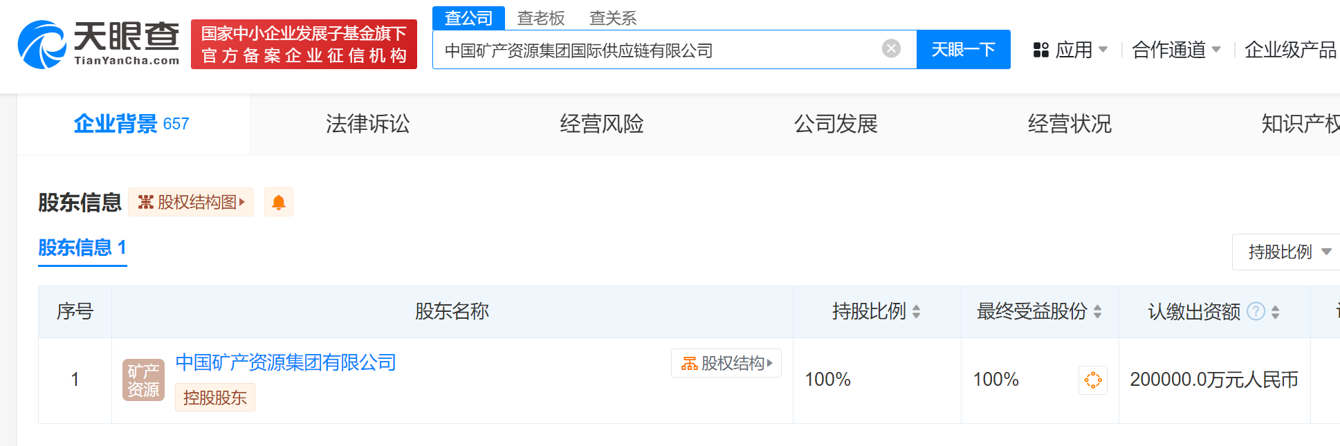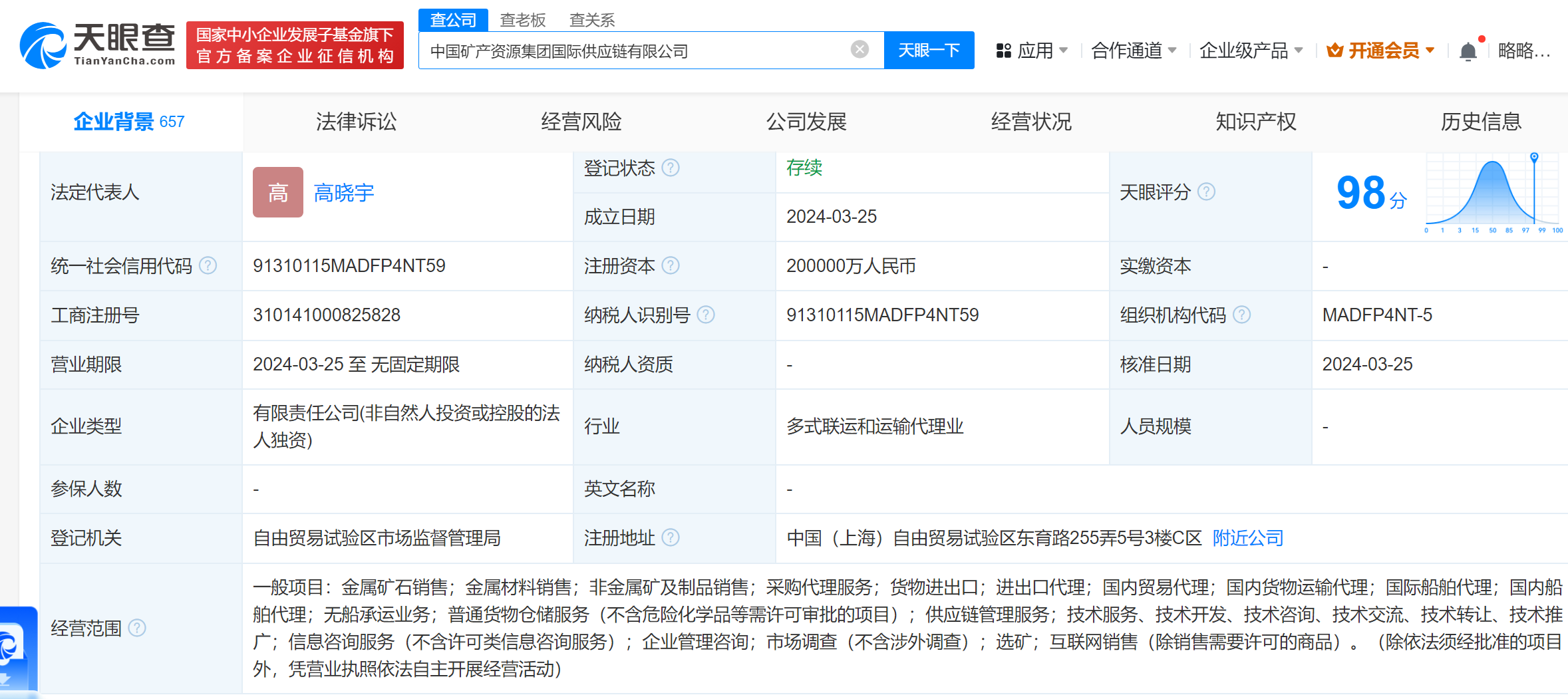 企查查APP显示,近日,中国矿产资源集团国际供应链有限公司成立,法定代表人为高晓宇,注册资本20亿元,经营范围包含:金属矿石销售,金属材料销售,非金属矿及制品销售,选矿,互联网销售等。企查查股权穿透显示,该公司由中国矿产资源集团有限公司全资持股。