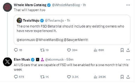 马斯克在回复一位用户的帖子时表示,该试验将扩展到所有尚未体验过FSD Beta版的现有车主。