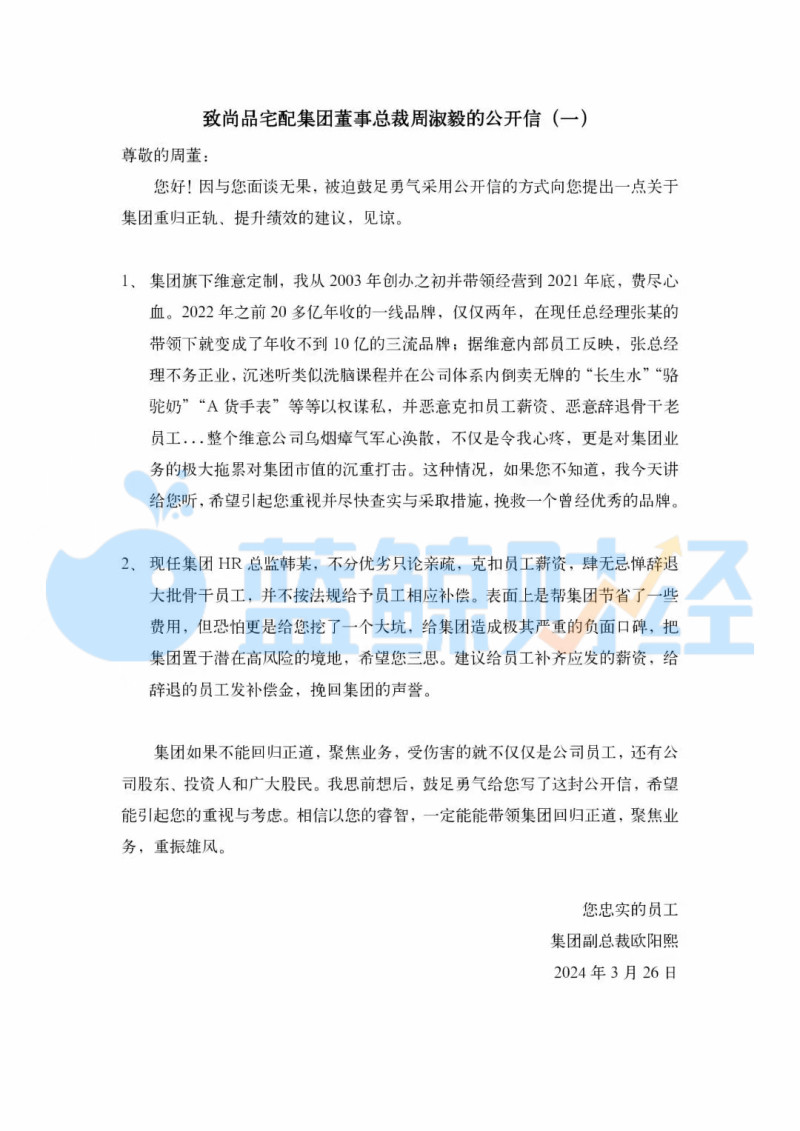 3月26日,蓝鲸财经独家获悉,尚品宅配集团副总裁欧阳熙在其微信朋友圈发布致尚品宅配集团董事、总经理周淑毅的公开信,信中称集团旗下维意定制现任总经理张某任职期间,维意定制营收从2022年之前的20多亿元年收入,降至年收入不足10亿元。公开资料显示,现任维意定制总经理是张志芳,自2022年1月上任。此外,欧阳熙还在公开信中称,尚品宅配集团现任HR总监韩某不分优劣只论亲疏,克扣员工薪资,辞退大批骨干员工,并不按法规给予员工相应补偿。