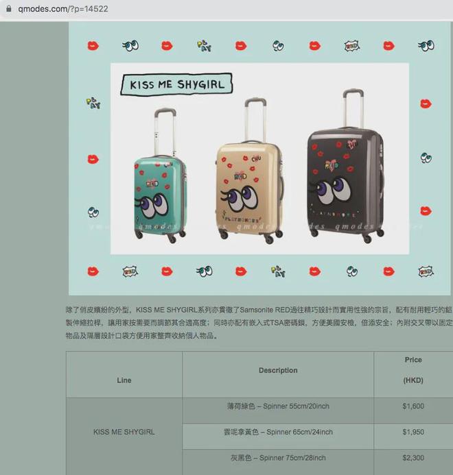 我的行李箱是Samsonite RED X PLAYNOMORE联名款下的KISS ME SHYGIRL系列,属于限量版,其上市时市场价为1950港元,约合人民币1775元。