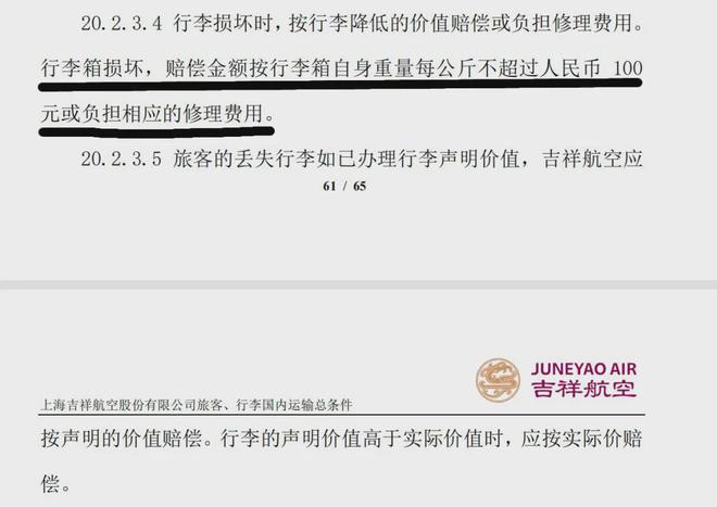 那么,对于郑女士行李箱损坏,最终只能赔偿500元的处理,究竟是依据哪条规定?吉祥航空方面的解释是,依据的是《吉祥航空股份有限公司旅客、行李国内运输总条件》相关规定。帮忙君查询到该“总条件”对于行李赔偿有如下规定:行李损坏时,按行李降低的价值赔偿或负担修理费用。行李箱损坏,赔偿金额按行李箱自身重量每公斤不超过人民币100元或负担相应的修理费用。