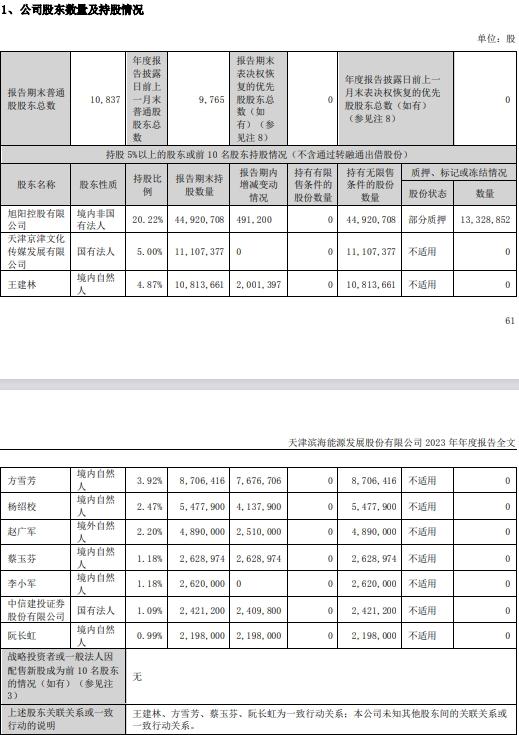 滨海能源2023年年报显示,截至2023年末,王建林仍直接持有4.87%的股份,为第三大股东,其一致行动人方雪芳、蔡玉芬、阮长虹分别还持有3.92%、1.18%和0.99%的股份。由此计算,合计持有的股份比例仍高达10.96%。
