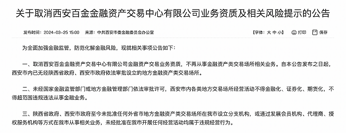 西安市金融办表示,取消西安百金金融资产交易中心有限公司金融资产交易业务资质,不再从事金融资产类交易场所相关业务。自公告发布之日起,西安市内已无经陕西省政府、西安市政府依法审批设立的地方金融资产类交易场所。