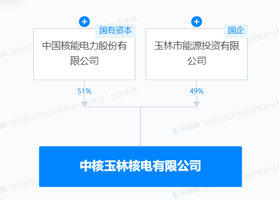 3月25日消息,天眼查显示,近日,中核玉林核电有限公司成立,法定代表人为魏智刚,注册资本5亿元,经营范围包含:海水淡化处理;核电设备成套及工程技术研发;工程和技术研究和试验发展等。股权穿透显示,该公司由中国核电、玉林市能源投资有限公司共同持股。