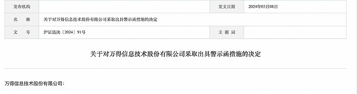 根据《证券基金经营机构信息技术管理办法》第五十九条、《证券期货业网络和信息安全管理办法》第六十二条第二款规定,上海证监局决定,对万得采取出具警示函的监管措施,并记入证券期货市场诚信档案。