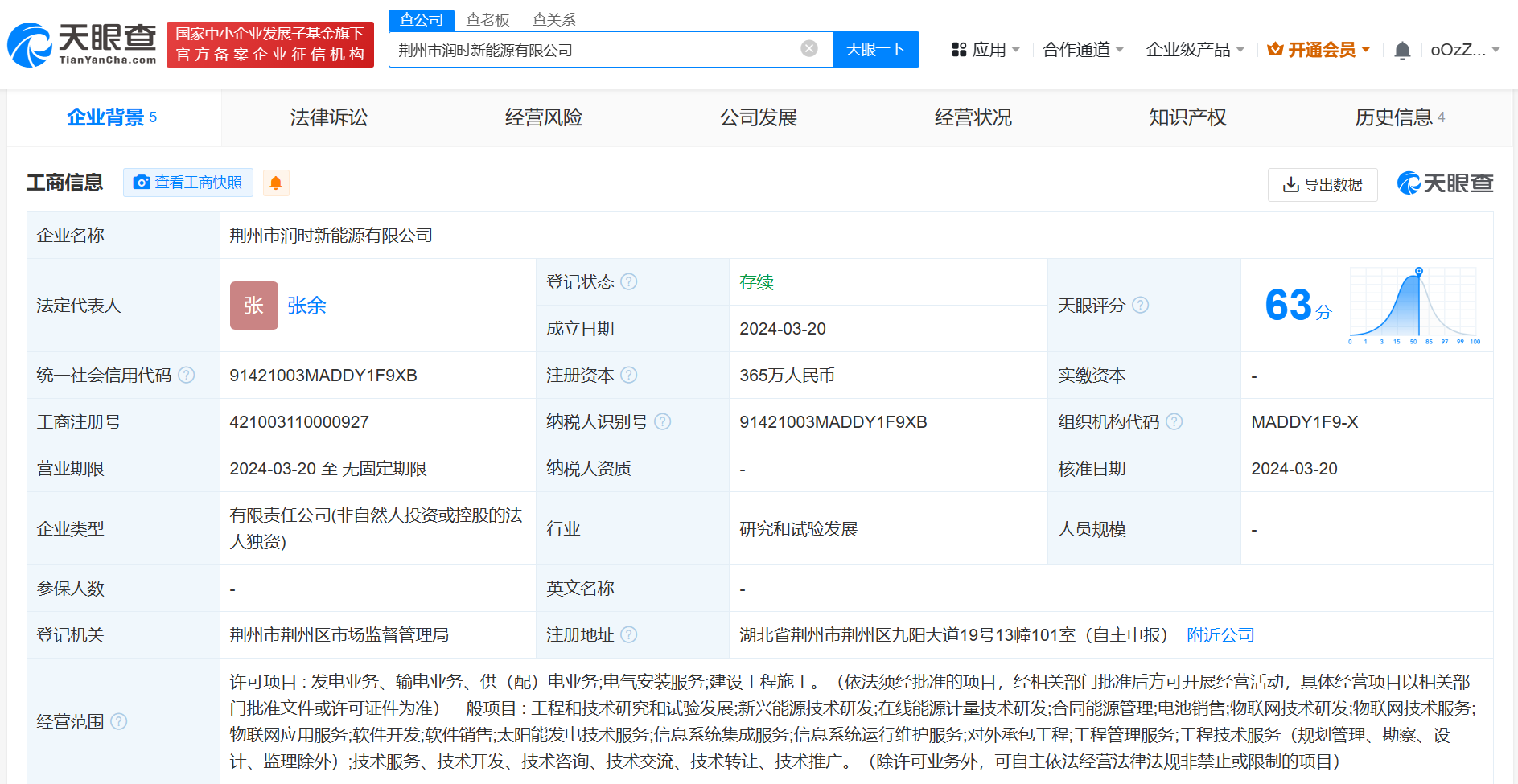 天眼查App显示,近日,荆州市润时新能源有限公司成立,法定代表人为张余,注册资本365万元,经营范围含工程和技术研究和试验发展、新兴能源技术研发、电池销售、物联网技术研发、太阳能发电技术服务等。股权全景穿透图显示,该公司由时代绿色能源有限公司全资持股,后者为宁德时代全资子公司。