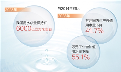 记者近日从水利部获悉:水利部门全面贯彻落实“节水优先、空间均衡、系统治理、两手发力”治水思路,推动用水方式向节约集约转变。初步统计显示,2023年我国用水总量保持在6000亿立方米左右。这意味着,2014年以来,我国国内生产总值增长近一倍的情况下,用水总量总体稳定在6100亿立方米以内;与2014年相比,2023年万元国内生产总值用水量、万元工业增加值用水量分别下降41.7%、55.1%。全国用水“账单”里的变与不变,反映了用水效率和效益持续提升,印证了发展质量和效益不断提高。