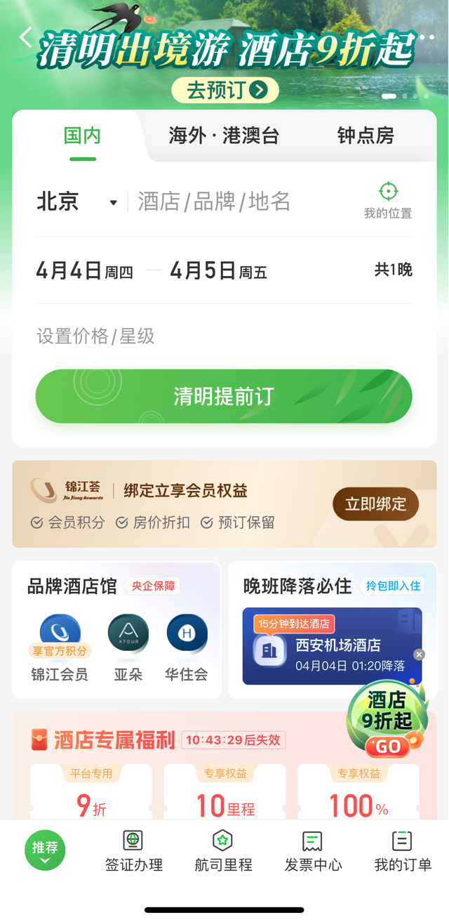 出游热度上涨的同时,多地酒店也变得“抢手”。为给旅客带来兼具品质与实惠的旅行体验,航旅纵横的酒店预订服务推出航班延误免费退、品牌酒店享积分等多项保障权益。此外,旅客在预订酒店时,还能积累航司里程,单笔订单金额每满50元就可选择兑换国航、东航、海航任意一家航空公司的10里程积分。通过此活动,旅客可更方便快速地积累航司里程,兑换航旅PLUS会员、休息室立减券、航司商城产品等。