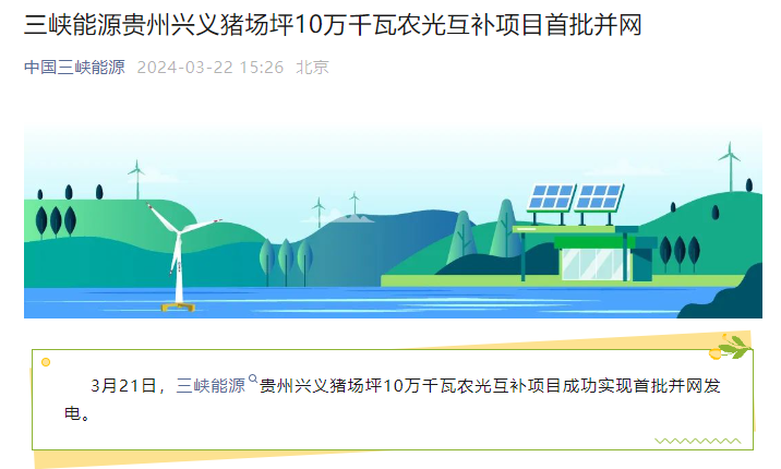 据三峡能源消息,3月21日,三峡能源贵州兴义猪场坪10万千瓦农光互补项目成功实现首批并网发电。项目总装机规模10万千瓦。项目建成后,每年可为电网提供清洁电能1.45亿千瓦时,每年可节约标准煤约4.4万吨,可减少二氧化碳排放量约12.1万吨,具有显著的节能减排效益。