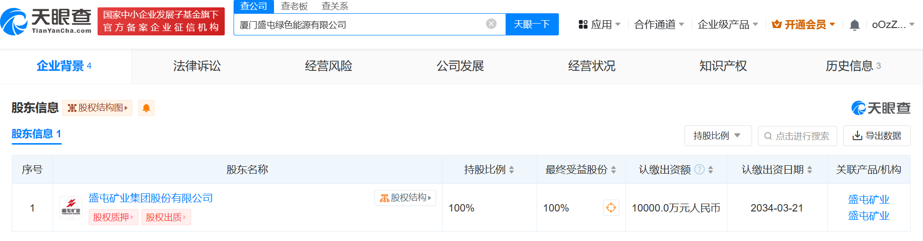 天眼查App显示,近日,厦门盛屯绿色能源有限公司成立,法定代表人为张振鹏,注册资本1亿人民币,经营范围含光伏设备及元器件销售、太阳能发电技术服务、环保咨询服务、风力发电技术服务、储能技术服务、电池销售等。股东信息显示,该公司由盛屯矿业全资持股。