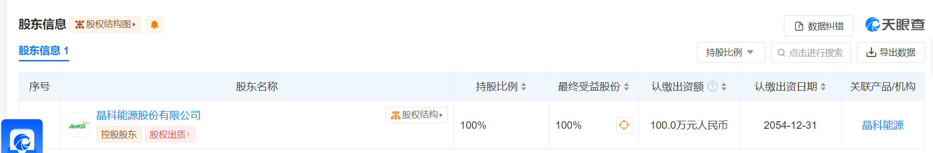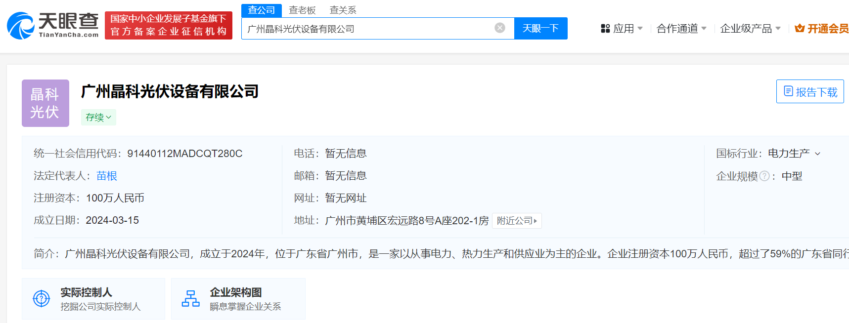 天眼查App显示,近日,广州晶科光伏设备有限公司成立,法定代表人为苗根,注册资本100万人民币,经营范围为太阳能热发电装备销售、光伏设备及元器件销售。股东信息显示,该公司由晶科能源全资持股。