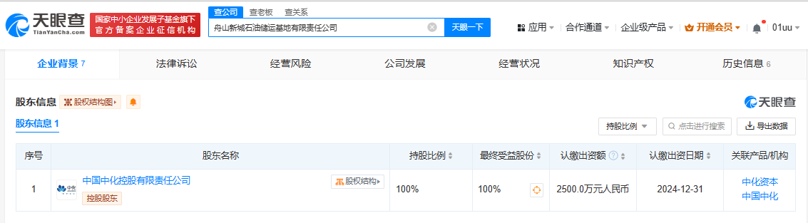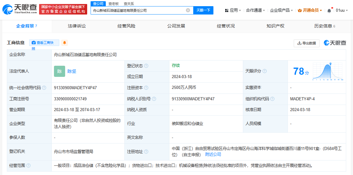 天眼查App显示,近日,舟山新城石油储运基地有限责任公司成立,法定代表人为陈坚,注册资本2500万人民币,经营范围含成品油仓储、货物进出口、技术进出口、机械设备租赁。股东信息显示,该公司由中国中化控股有限责任公司全资持股。
