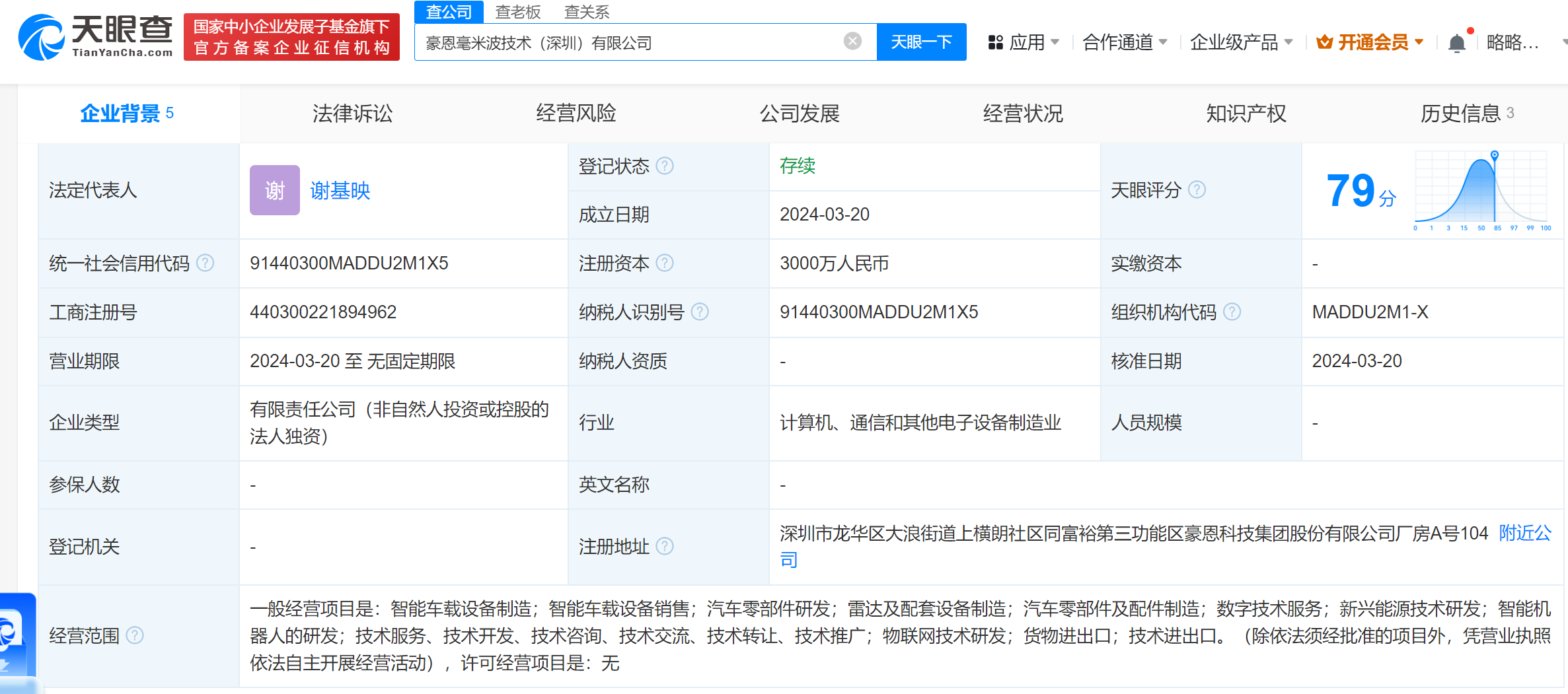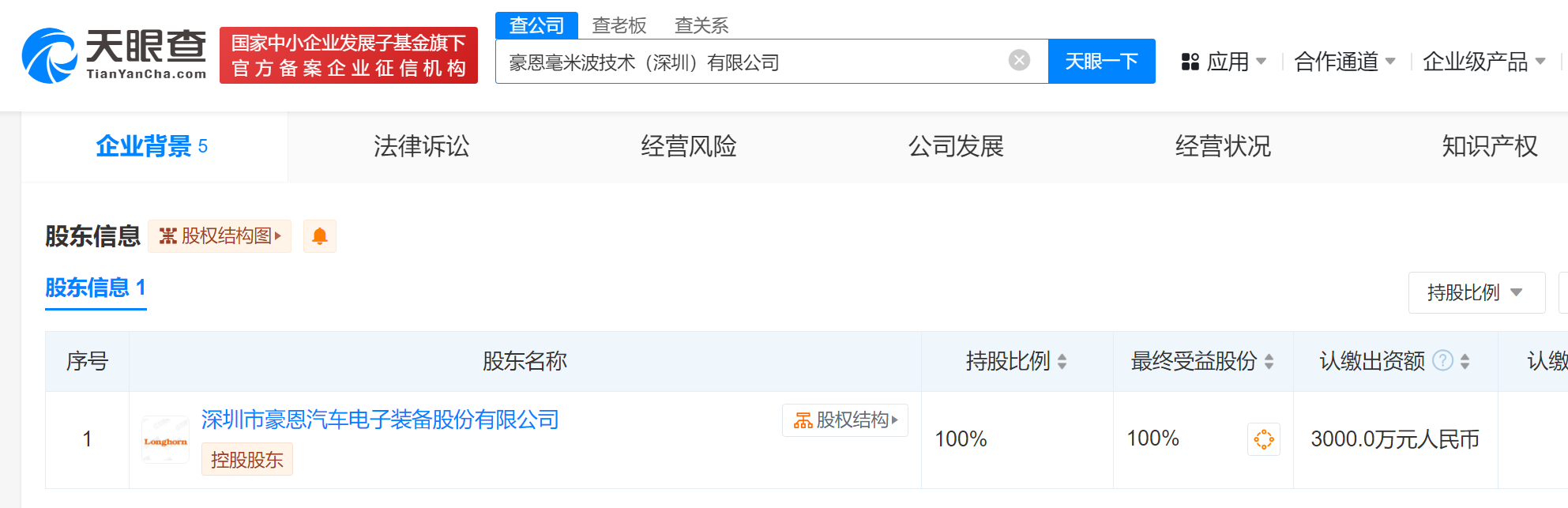 天眼查App显示,近日,豪恩毫米波技术(深圳)有限公司成立,法定代表人为谢基映,注册资本3000万人民币,经营范围含智能车载设备制造和销售、汽车零部件研发、雷达及配套设备制造、数字技术服务、新兴能源技术研发、智能机器人的研发等。股东信息显示,该公司由豪恩汽电全资持股。