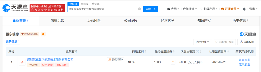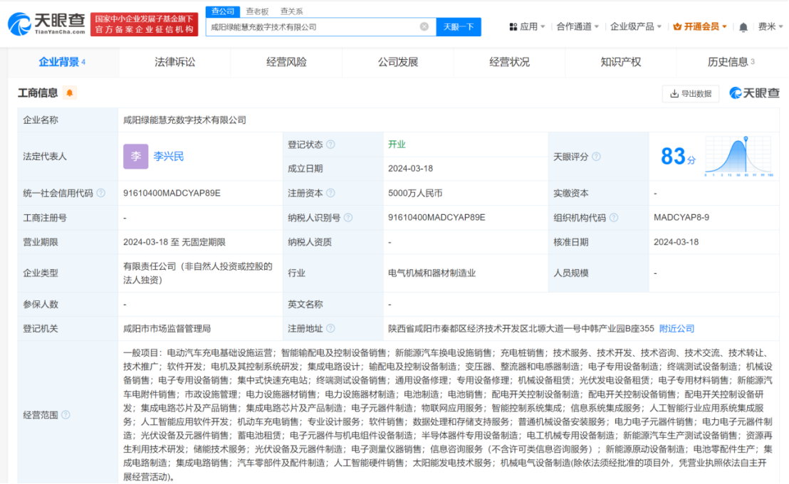 天眼查App显示,近日,咸阳绿能慧充数字技术有限公司成立,法定代表人为李兴民,注册资本5000万人民币,经营范围含充电桩销售、人工智能行业应用系统集成服务、人工智能应用软件开发、集成电路制造、人工智能硬件销售等。股东信息显示,该公司由绿能慧充全资持股。